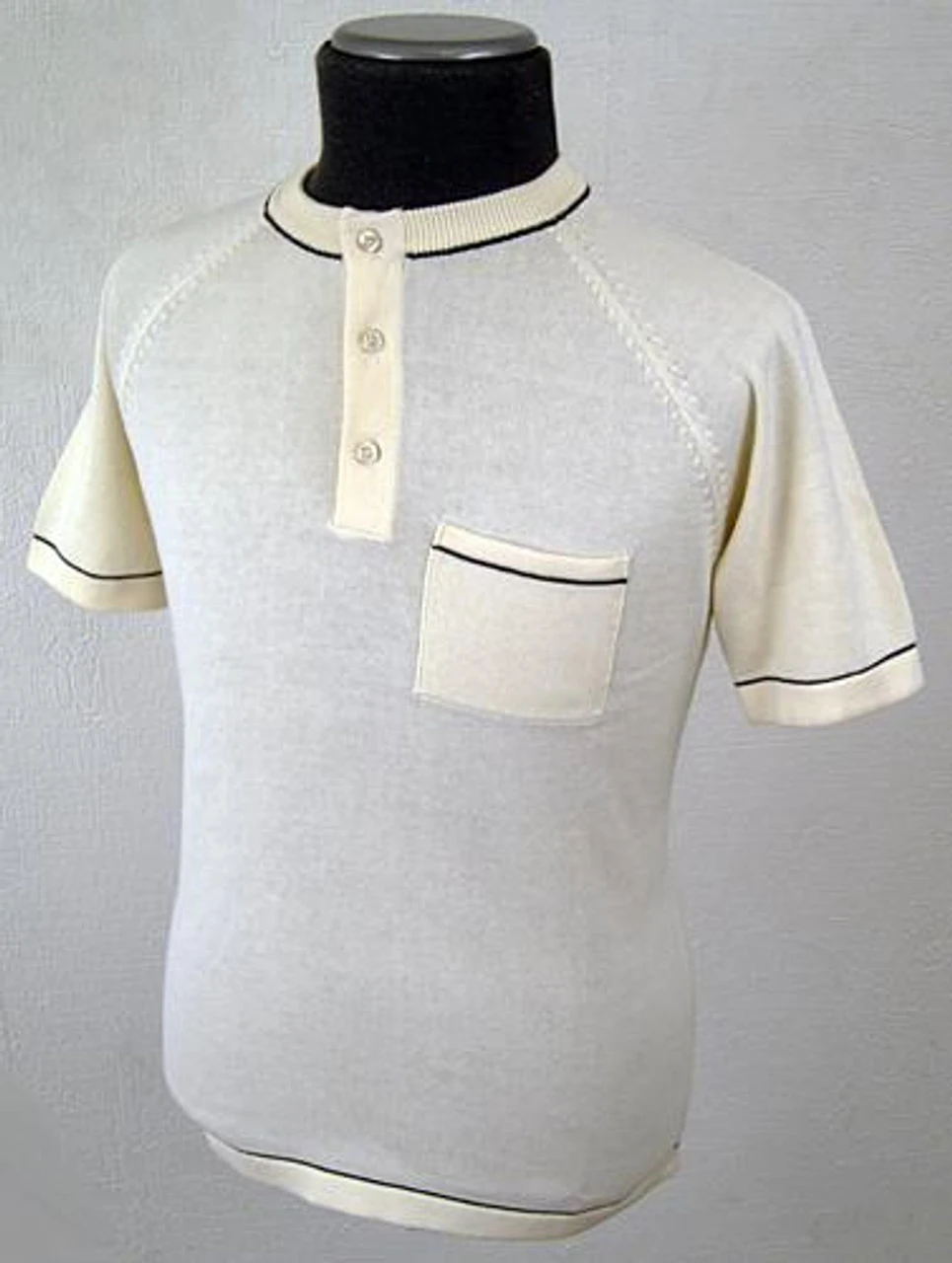 ‘GEAR’ SHORT SLEEVE MENS KNITTED MOD CYCLING TOP – by Madcap England. Mens knitted Retro cycling top. Off-white with subtle black trim. Left chest pocket. Short sleeve. Ribbed collar and cuffs. 3 button fasten. 100% Cotton.